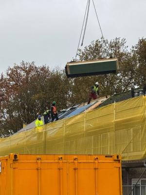 Samen met Heijmans en AA Dak werkt Kuperus met Unilin op dit moment aan een bijzonder project in Roosendaal. Voor woningcorporatie Alwel worden 900 huurwoningen in de Roosendaalse wijk Elisadonk binnen afzienbare tijd verduurzaamd en geüpgraded naar energielabel A. Voor het renoveren van de daken wordt gebruik gemaakt van Usystem DS EAT,een prefab dak element, op maat gemaakt in de fabriek van Unilin in Oisterwijk. Het dak element voegt aan de buitenkant een isolerende schil toe, boven de bestaande dakconstructie. Tussen het bestaande dakbeschot en de nieuwe isolerende schil, wordt isolatie wol geplaatst, zodat eventuele kieren worden weggewerkt, en in de dakelementen zijn constructieve ribben opgenomen die zorgen voor interne stijfheid. Hierdoor kan het dak element horizontaal van bouwmuur tot bouwmuur overspannen, en wordt het bestaande dak volledig ontlast. Kuperus: “Dat betekent dragen en isoleren in één product. Hierdoor merken huurders weinig van de komst van het nieuwe dak: de bewoner blijft lekker thuis, ’s morgens komt er een steiger in de tuin, en paar uur later zit het dak erop. Dat was ook de vraag van de corporatie.”